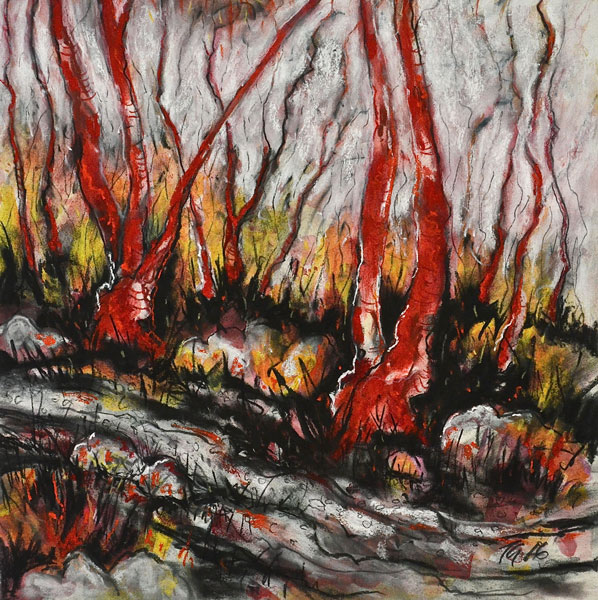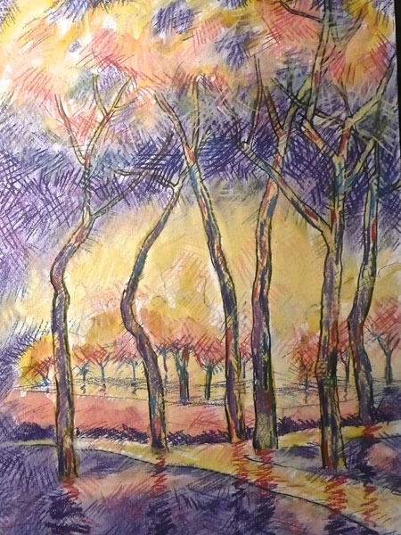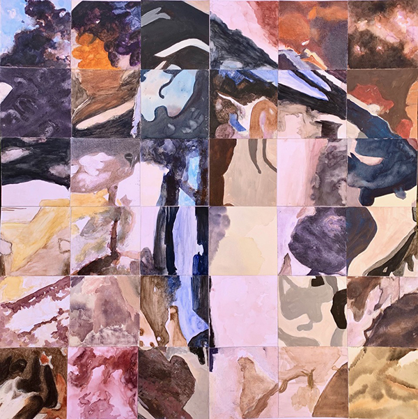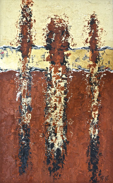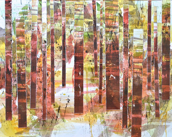 After a stay in the Kalgoorlie Goldfields area of Western Australia, he has produced a series of paintings: WOODLANDS. These are based on an abstracted idea of the trees of the Great Western Woodlands, particularly the Blackbutt trees – Eucalyptus lesouefii.