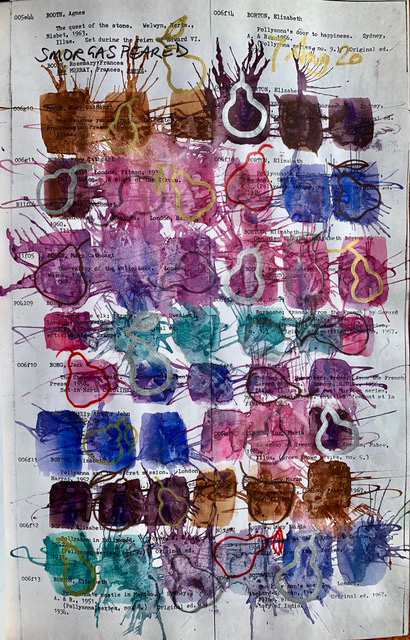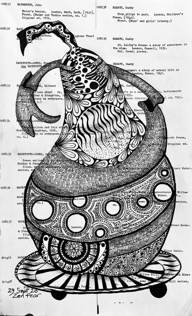 So, from 6 August 2020 for two months, I drew PEARS. I did them in a 1980’s A3 hardbound library catalogue of children’s literature. There are over 90 pages of PEARS, all with a text background.