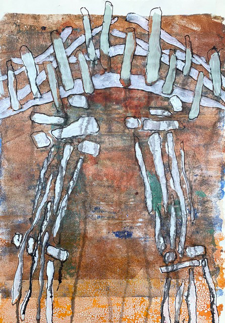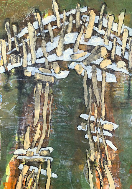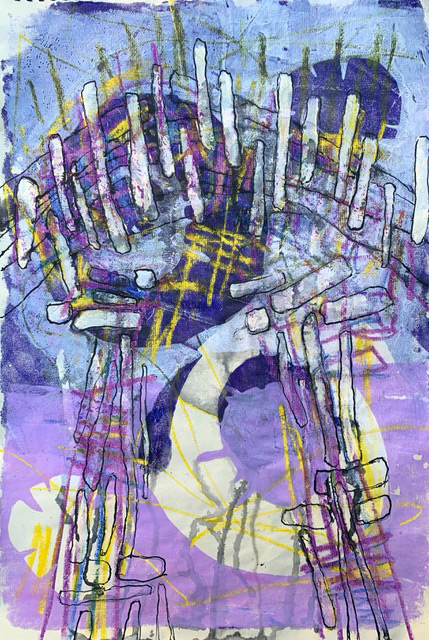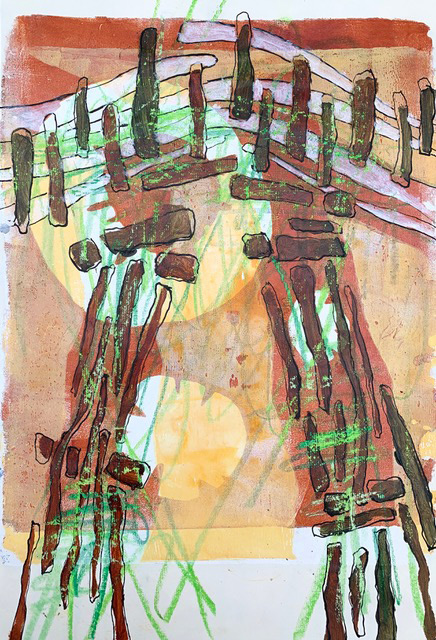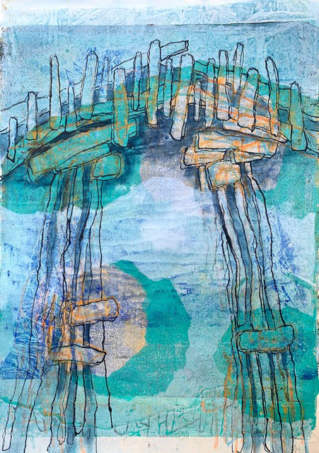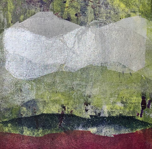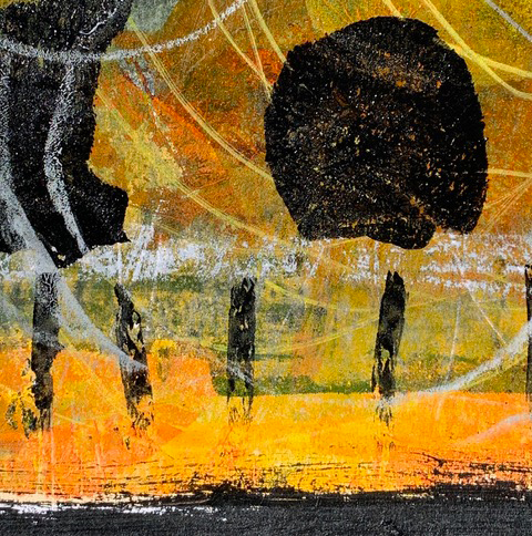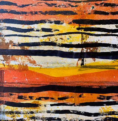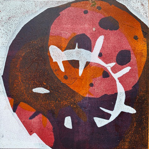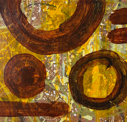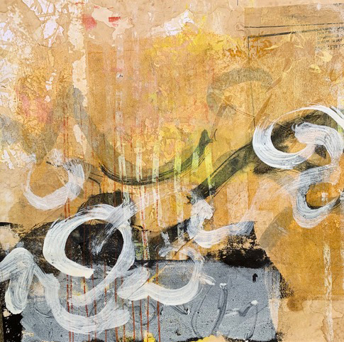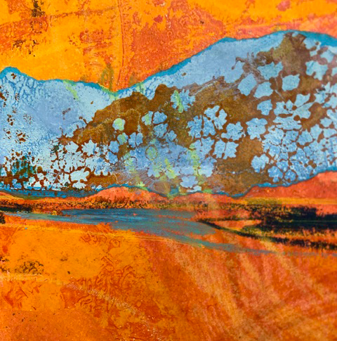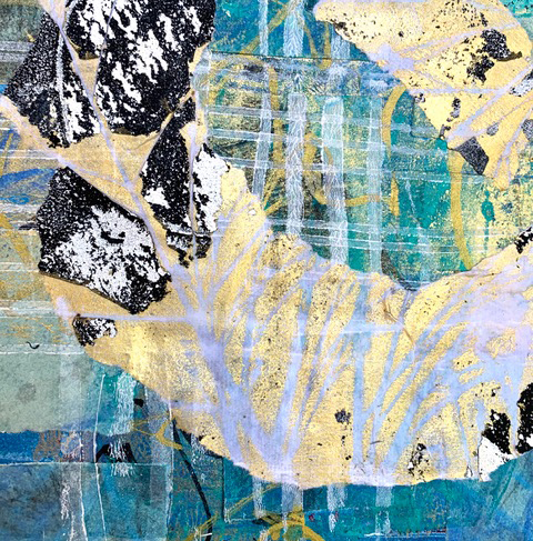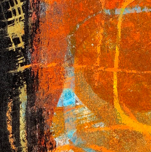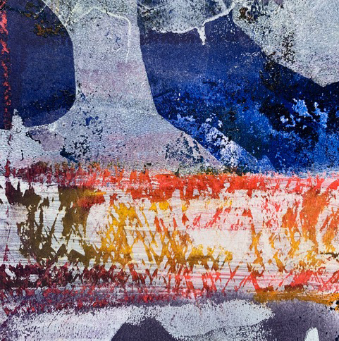 These square images are details of gel printing with acrylics exploring abstract possibilities on a small scale using a silicone pad and transparent acrylic colours. The prints show varied surfaces, often with other media, created from a range of marks, designs and textures employing for example; stencils, masks, resists, layering and linework.